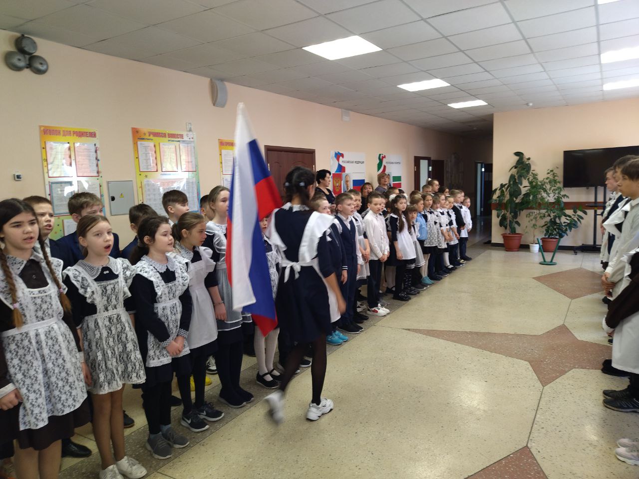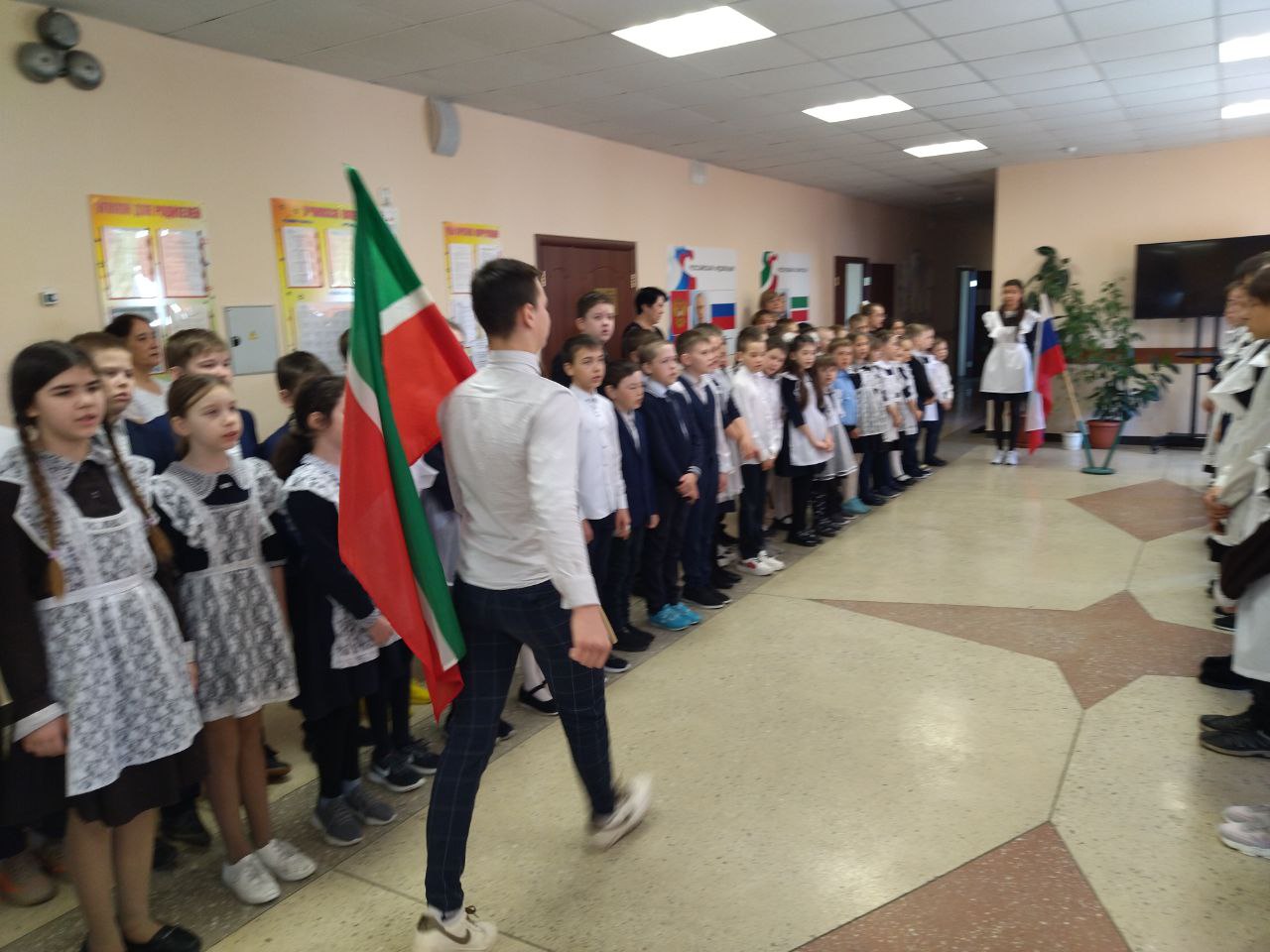 Четвертая четверть традиционно началась с общешкольной линейки, с выноса флагов и исполнения гимнов. Почетное право вынести флаг Российской Федерации и флаг Республики Татарстан на этой неделе было предоставлено победителям в Первенстве Камско - Устьинского района по бадминтону Мухамадуллиной К. и Зиновьеву Р.