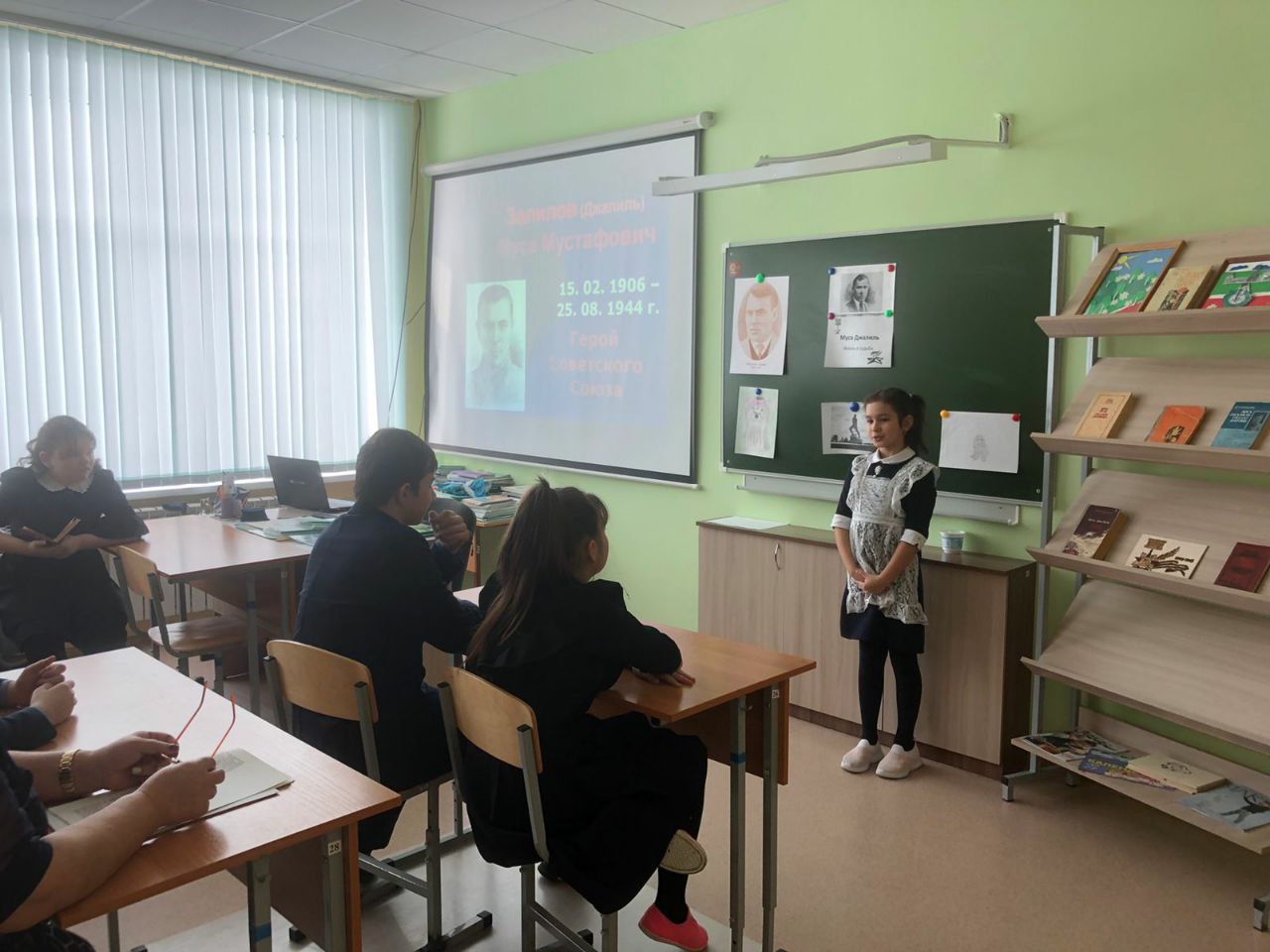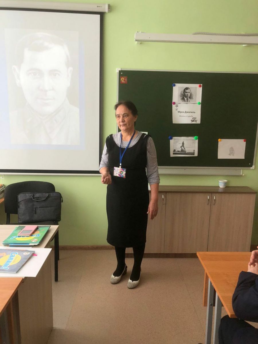 В рамках месячника гражданско- патриотического воспитания в нашей школе прошёл урок мужества, посвящённый 117 - летию со дня рождения татарского поэта -героя Мусы Джалиля. В ходе мероприятия учитель истории Тагирова М. Г. и учитель татарского языка Хусаинова В. Р. рассказали об интересных фактах из жизни поэта, литературной деятельности, о героических страницах жизни в годы Великой Отечественной войны.И, конечно, ребят не оставило равнодушным знакомство с циклом «Моабитская тетрадь». Ученики просмотрели презентацию о малоизвестных фактах из жизни поэта, а также о памятных местах, связанных с именем поэта- героя. В заключение прозвучали стихи «Мои песни», «Красная ромашка», «Яулык», «Бер шигырь». Стихи Джалиля живы и будут жить вечно, пока мы их читаем.