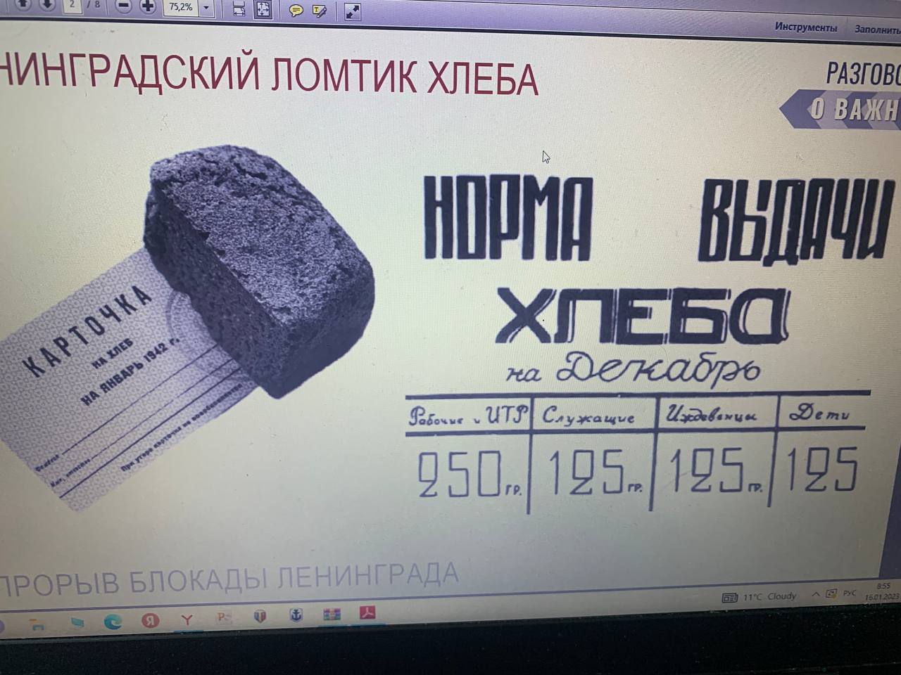 Сегодняшние "Разговоры о важном" мы посвятили важной, но очень печальной теме. В эти январские дни наша страна вспоминает страшныесобытия, произошедшие в годы Великой Отечественной войны – блокаду Ленинграда. Лишь 18 января 1943 года блокадное кольцобыло прорвано (в этом году в январе исполняется 80 лет с даты прорыва блокады). По итогам просмотра видео состоялось проблемно-ценностное общение в классе, группах, выполнение заданий. На занятии говорили о важных понятиях: заботе о близких (детях, стариках, больных), занятия творчеством (они также дают человеку дополнительные силы и позволяют выжить), регулярное выполнение какой-то работы (те блокадники, кто предпочитал оставаться дома в постели, умирали чаще, чем те, кто из последних сил заставлял себя встать и пойти что-то делать; «движение –жизнь» в прямом смысле этого слова), ведение дневника (отчасти это занятие спасало, отвлекая от постоянного чувства голода).