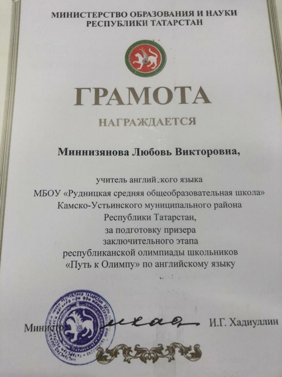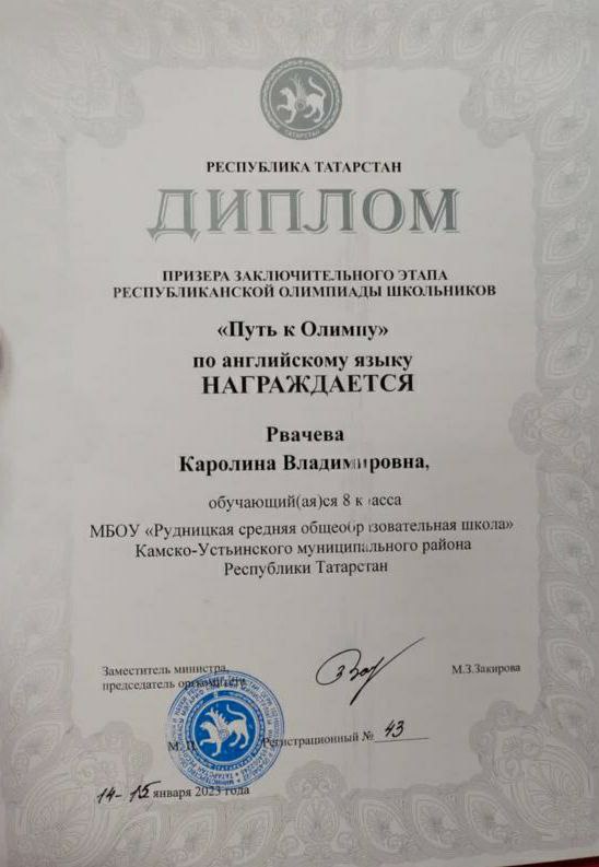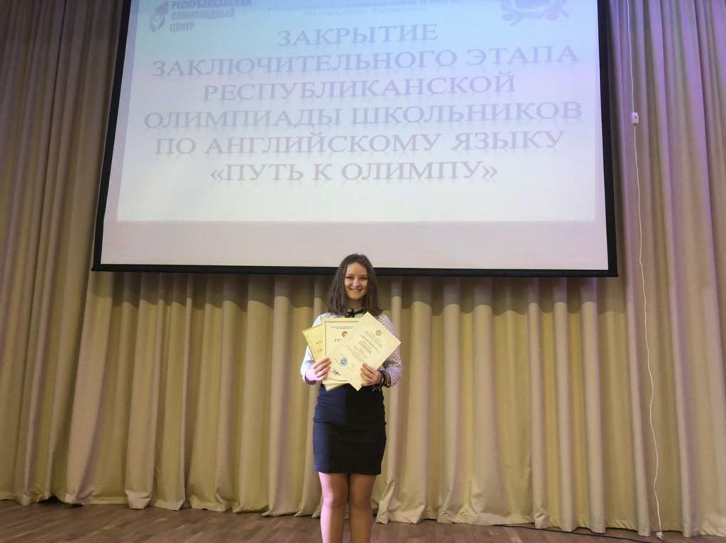 С 13 по 16 января в г.Казань прошла республиканская олимпиада школьников по английскому языку «Путь к Олимпу». В этой олимпиаде ученица 8 класса нашей школы Рвачева Каролина стала призером (учитель Миннизянова Л. В. ). Поздравляем Каролину и ее учительницу с высокими результатами, желаем дальнейших успехов и творческих побед.