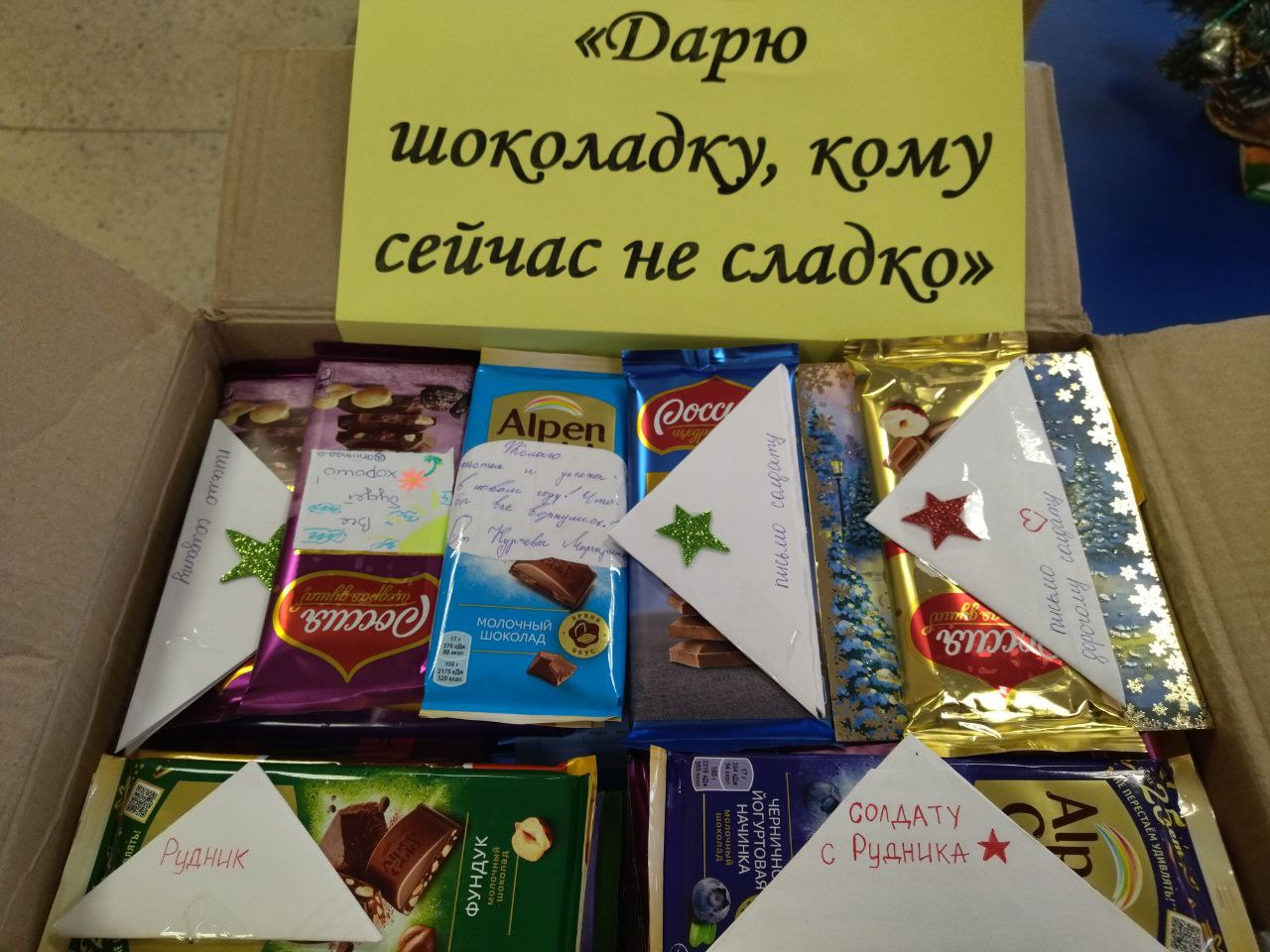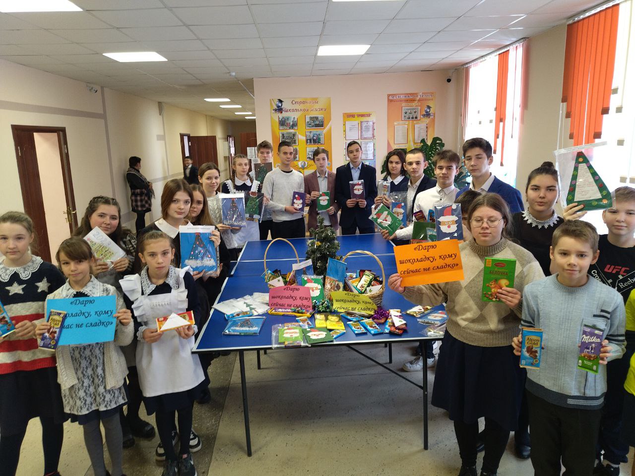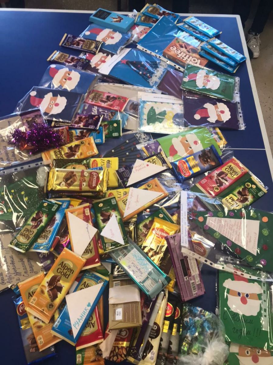 12 декабря в нашей школе стартовала акция "Дарю шоколадку, кому сейчас не сладко". Почти каждый ученик нашей школы принёс шоколадку, на которой написал добрые слова нашим дорогим ЗАЩИТНИКАМ. В акции также приняли участие все учителя и работники школы. Мы надеемся, что наши шоколадки поднимут настроение солдатам, а добрые слова от ребят напомнят им, что они лучшие и Победа обязательно будет за нами.