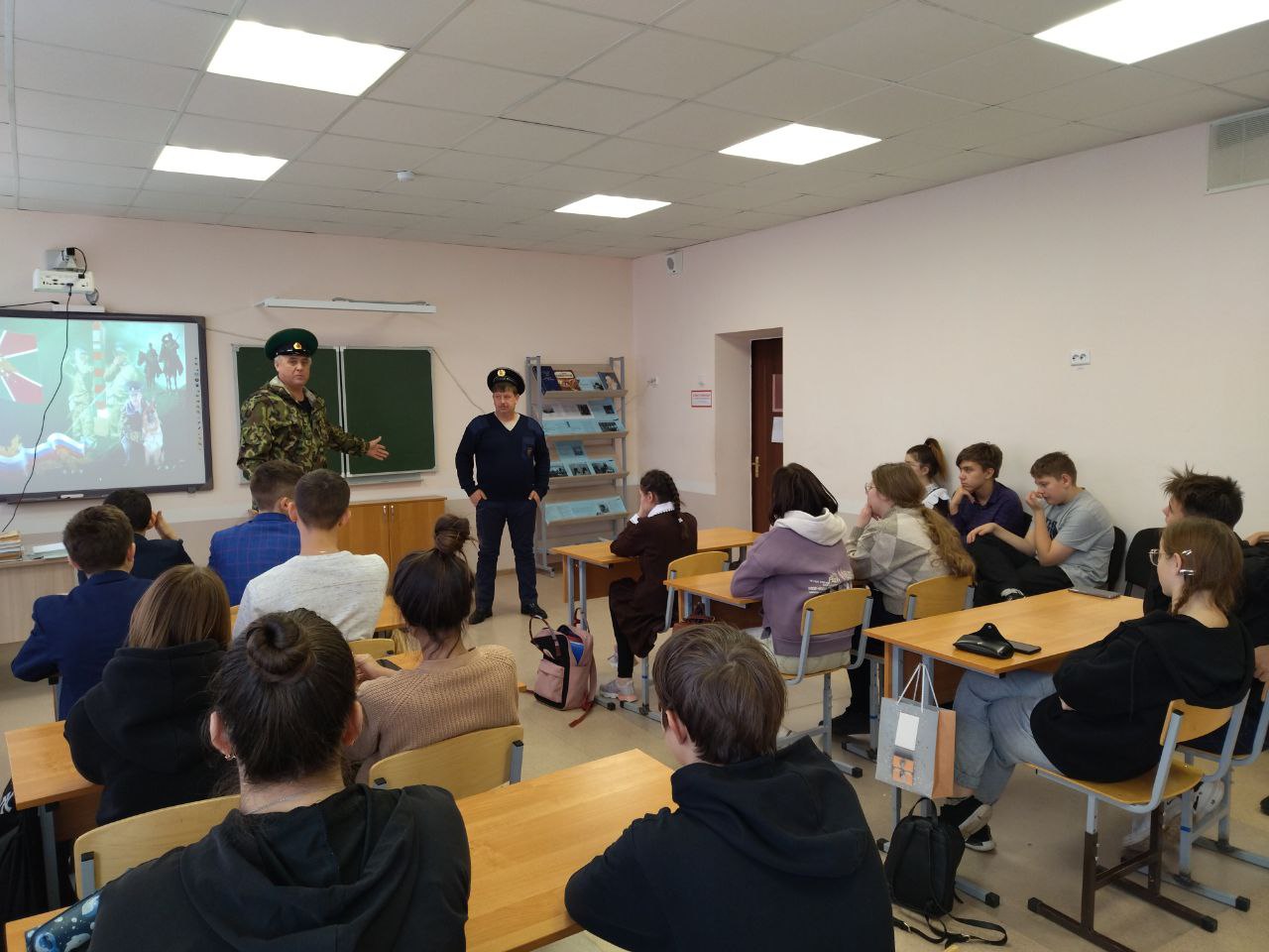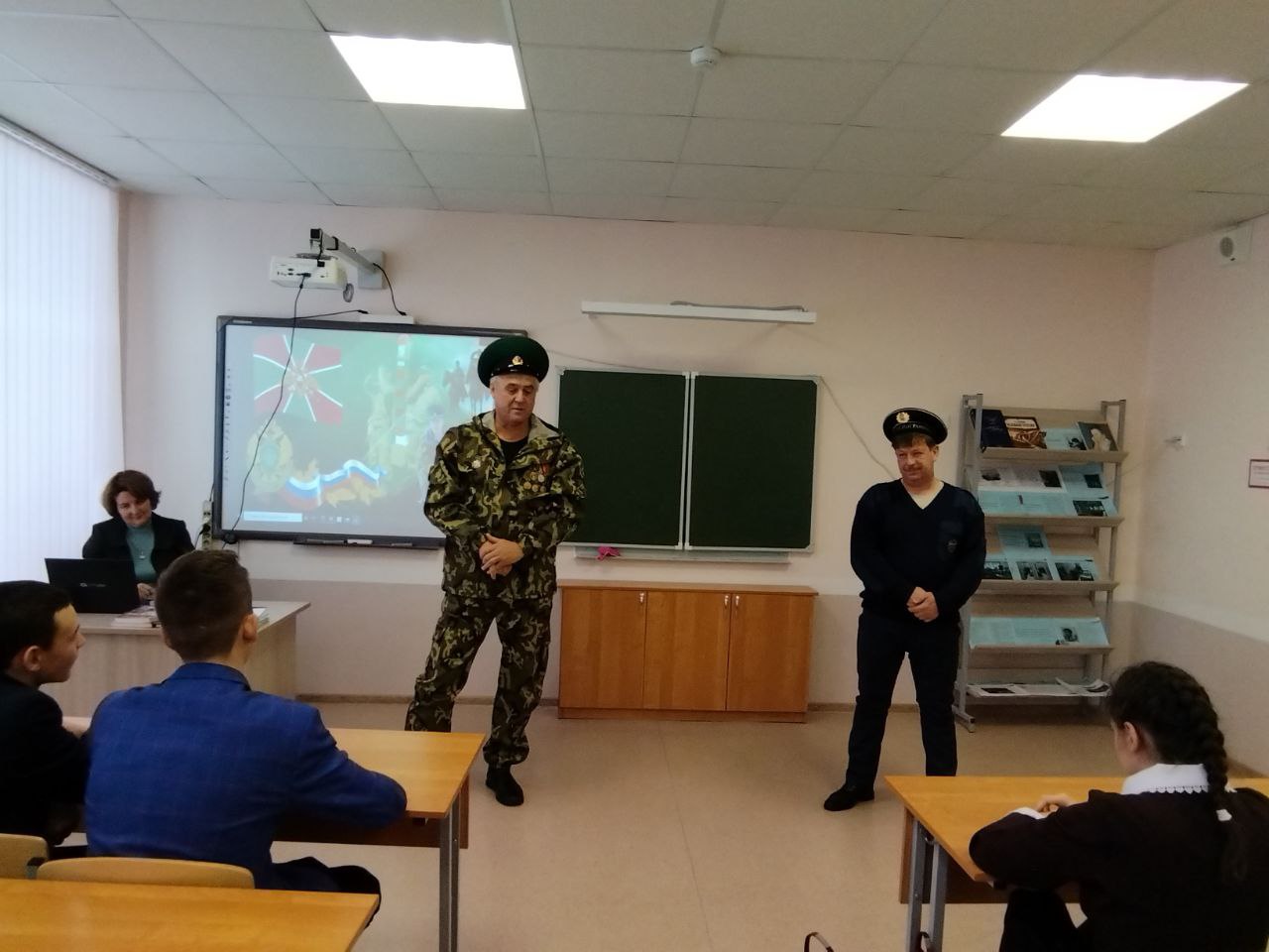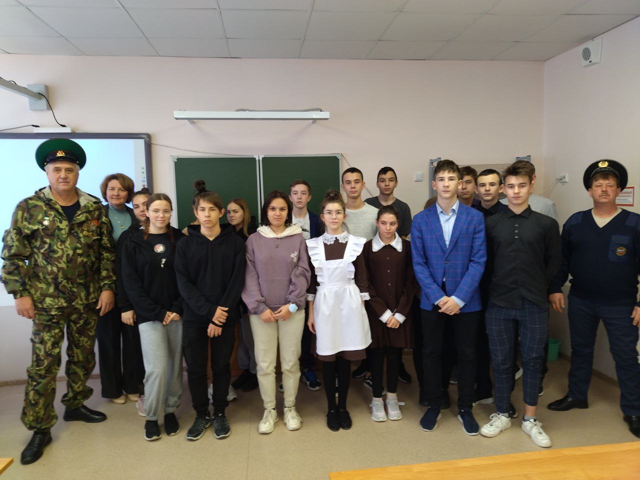 19 ноября в школе состоялась профориентационная встреча учащихся 9-11 классов с ветеранами пограничных войск. Перед старшеклассниками выступили Комаров Владимир Валентинович - старший водитель ПСЧ 116, пограничник на границе в Молдавии и Тарасов Федор Юрьевич, начальник караула ПСЧ 116, пограничник на границе на Дальнем Востоке.Ученики слушали рассказы зрелых мужчин с неподдельным интересом, затаив дыхание. У ребят возникали самые разнообразные вопросы. Ветераны старались подробно и интересно ответить на каждый детский вопрос. В заключении встречи советы от ветеранов-пограничников были просты: любить Родину, заниматься спортом и уважать своих товарищей, тогда и служба в армии будет не так тяжела.Встреча прошла в тёплой дружеской атмосфере, и пограничники явились для школьников примером преданного служения Родине. Встреча, несомненно, оставила неизгладимый след в душе учащихся, педагогов и гостей.