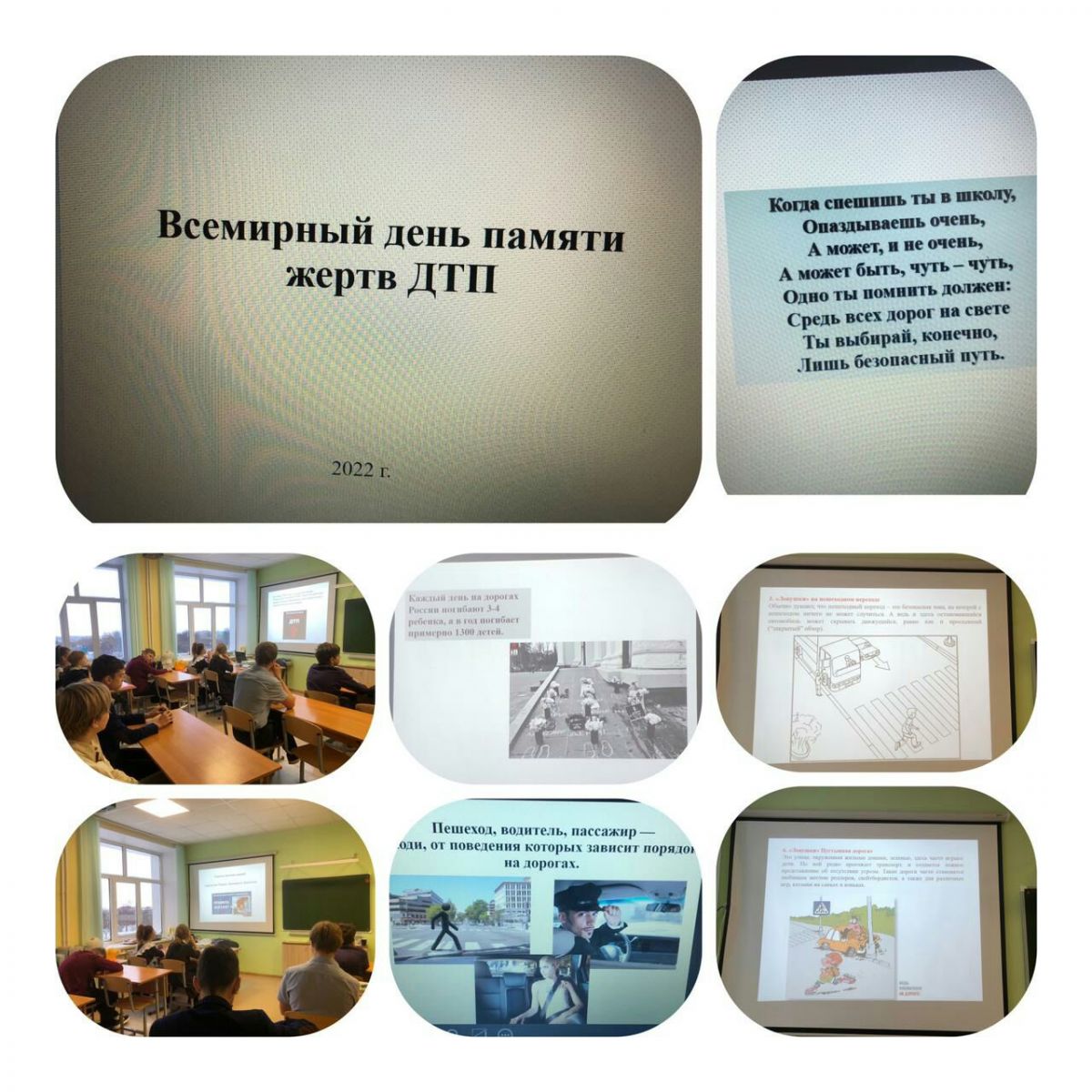 В 8 классе начался классный час со слов: ежегодно, в третье воскресенье ноября отмечается Всемирный день памяти жертв ДТП. Цель этого дня - не только почтить память безвременно ушедших жертв автокатастроф, но и еще раз обратиться ко всем участникам движения, призвать их к безопасному поведению на дорогах. Причины ДТП происходит по вине водителей, грубо нарушающих правила дорожного движения.Когда спешишь ты в школу,Опаздываешь очень,А может и не очень,А может быть чуть-чуть,Одно ты помнить должен:Средь всех дорог на светеТы выбирай, конечно,Лишь безопасный путь.