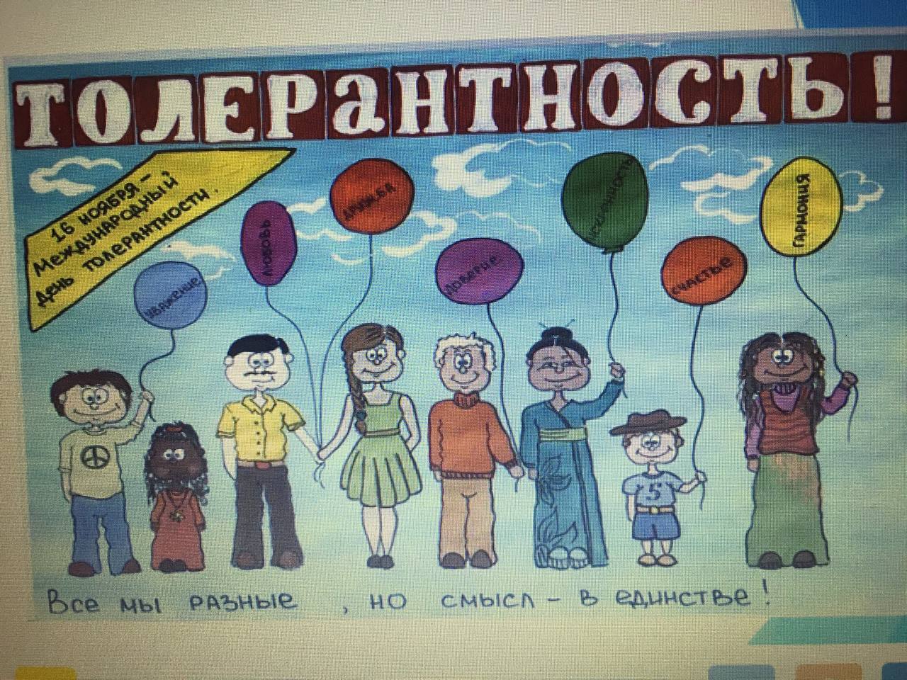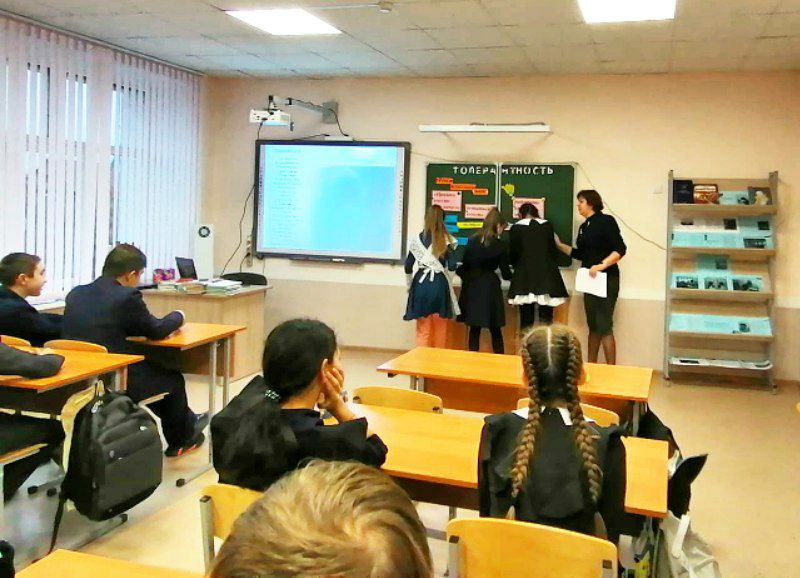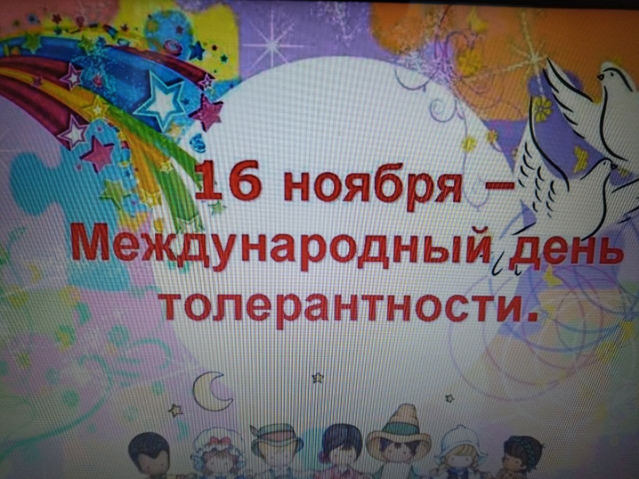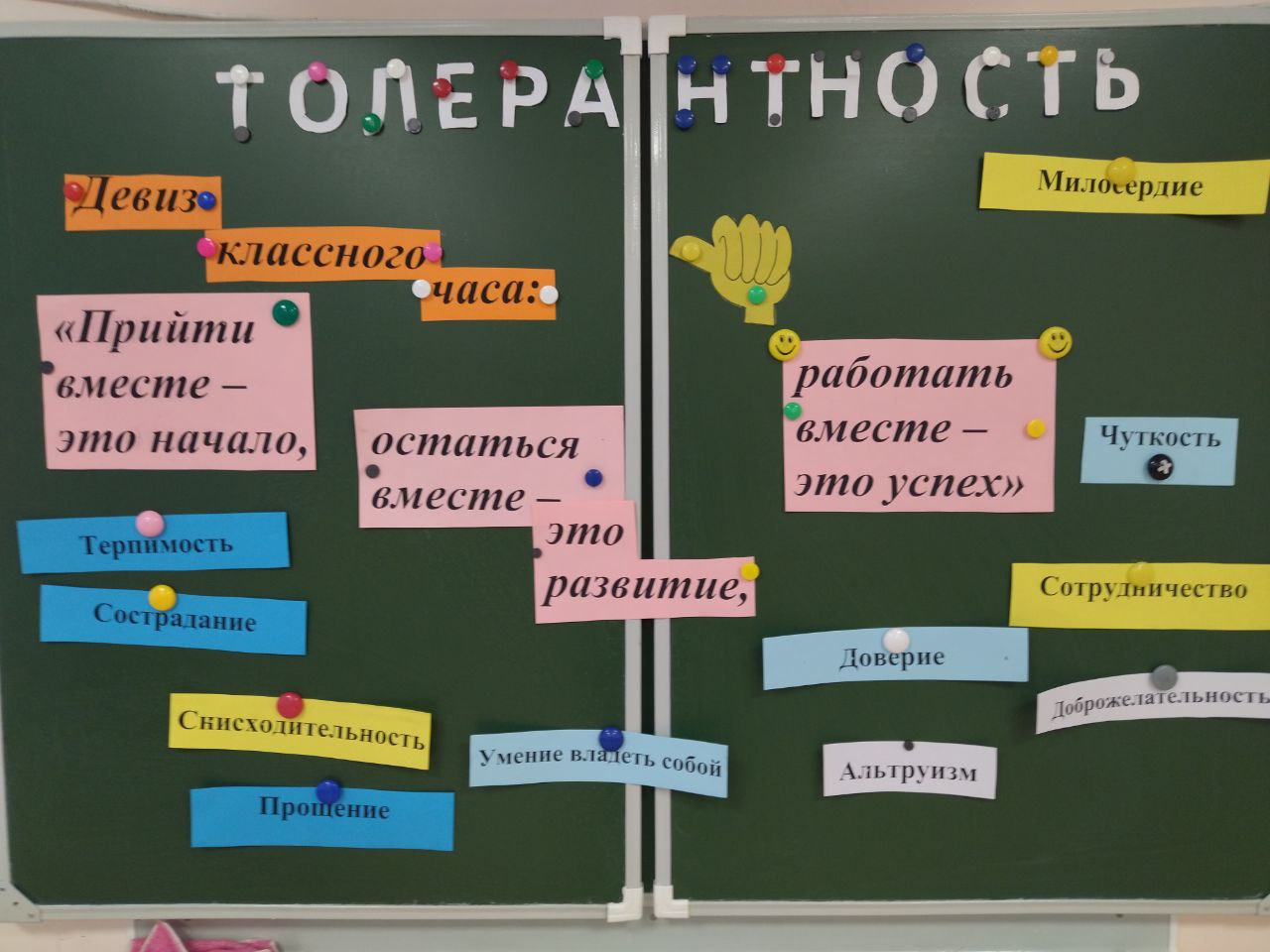 11 ноября в 5-7 классах прошёлКлассный час по теме: «Толерантность – путь к миру» под девизом:«Прийти вместе – это начало,остаться вместе – это развитие,работать вместе – это успех».Классный час способствовал развитию навыков групповой работы, умению вести диалог и аргументировать свою позицию, находить компромиссные решения обсуждаемых проблем. Обучающиеся показали высокий уровень творческой активности, продемонстрировали способности к познанию себя и других людей.Результатом работы в группах стали выводы обучающихся о толерантной и интолерантной личности, о том, каким они видят толерантный и интолерантный путь развития человека. Всем классом составлялись правила толерантного общения.