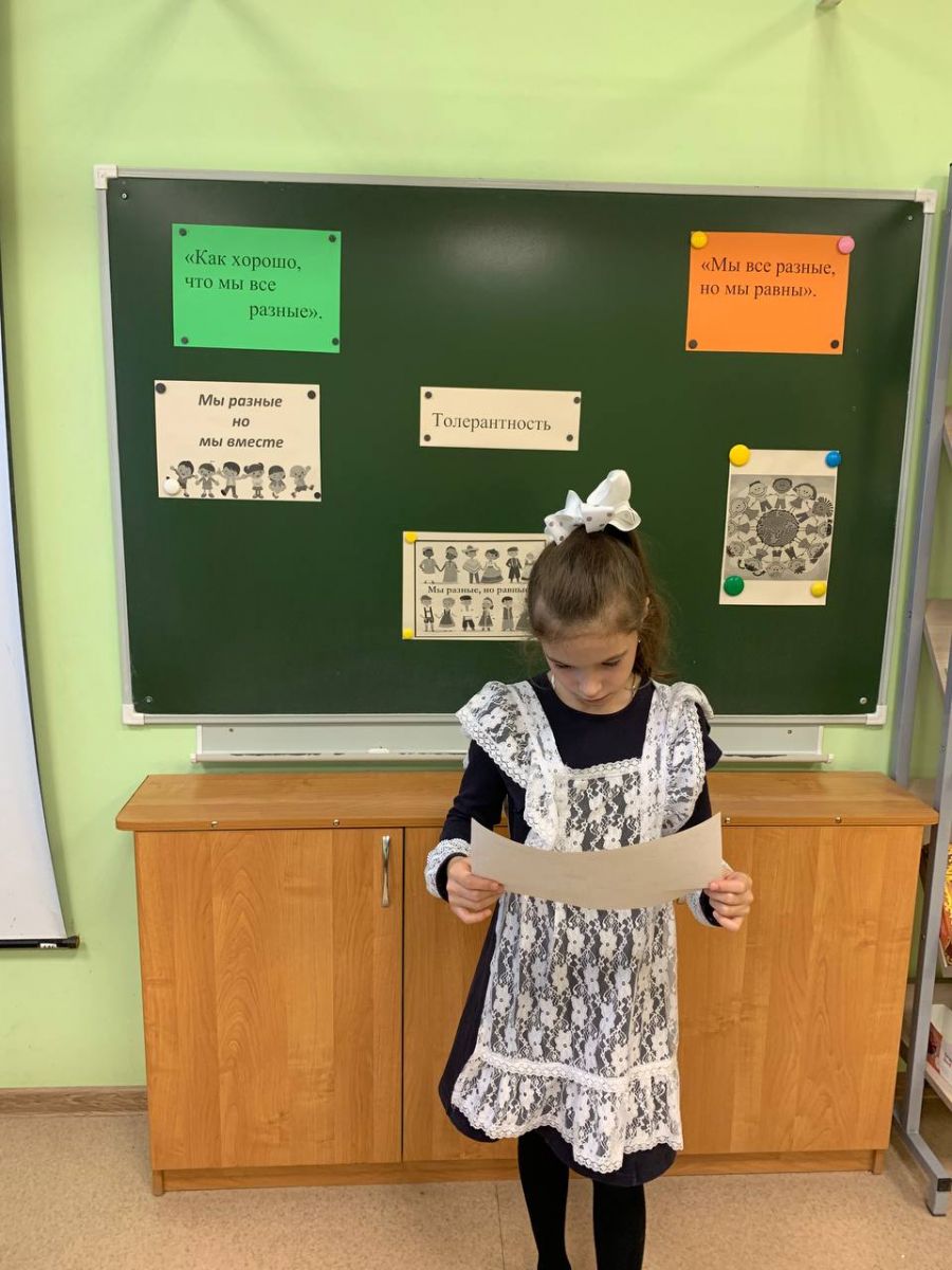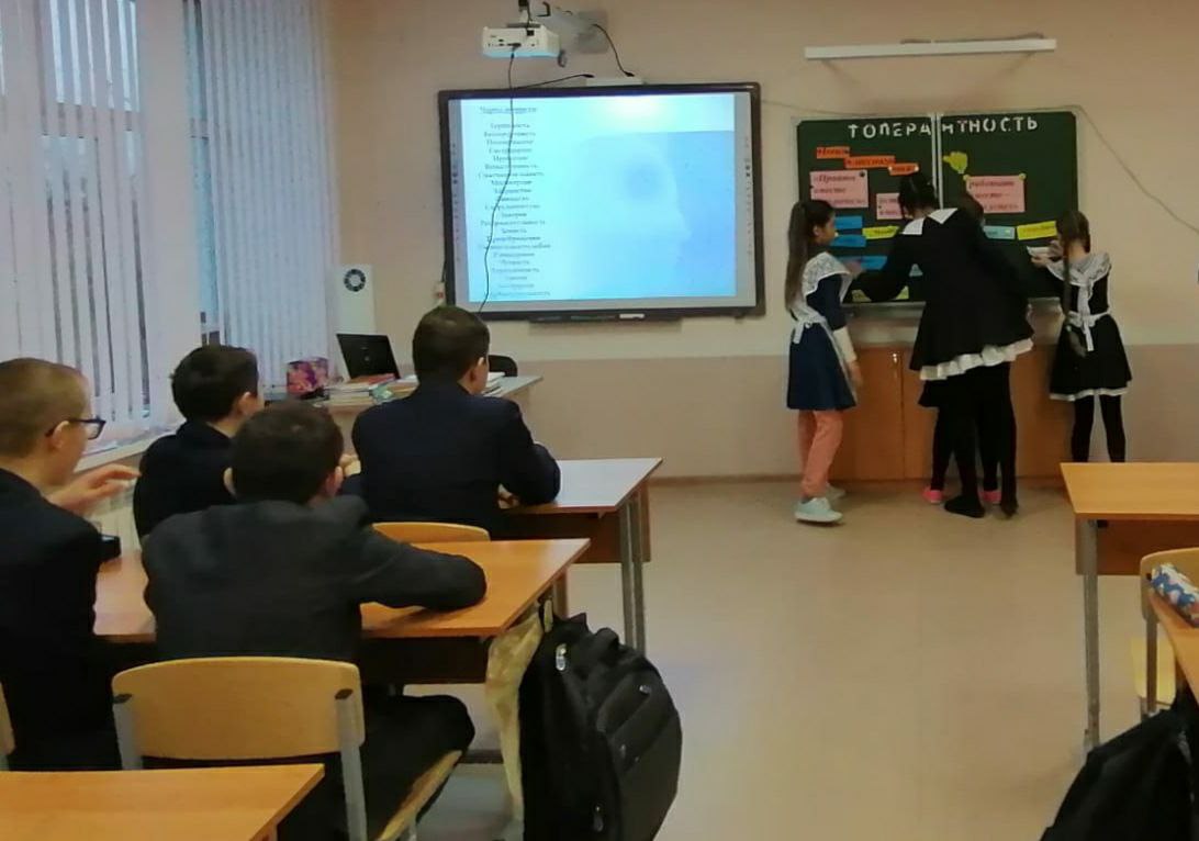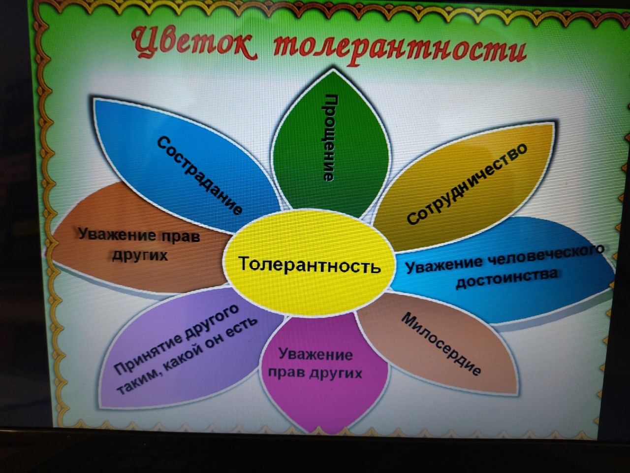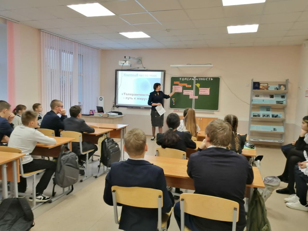 11 ноября в 5-7 классах прошёлКлассный час по теме: «Толерантность – путь к миру» под девизом:«Прийти вместе – это начало,остаться вместе – это развитие,работать вместе – это успех».Классный час способствовал развитию навыков групповой работы, умению вести диалог и аргументировать свою позицию, находить компромиссные решения обсуждаемых проблем. Обучающиеся показали высокий уровень творческой активности, продемонстрировали способности к познанию себя и других людей.Результатом работы в группах стали выводы обучающихся о толерантной и интолерантной личности, о том, каким они видят толерантный и интолерантный путь развития человека. Всем классом составлялись правила толерантного общения.