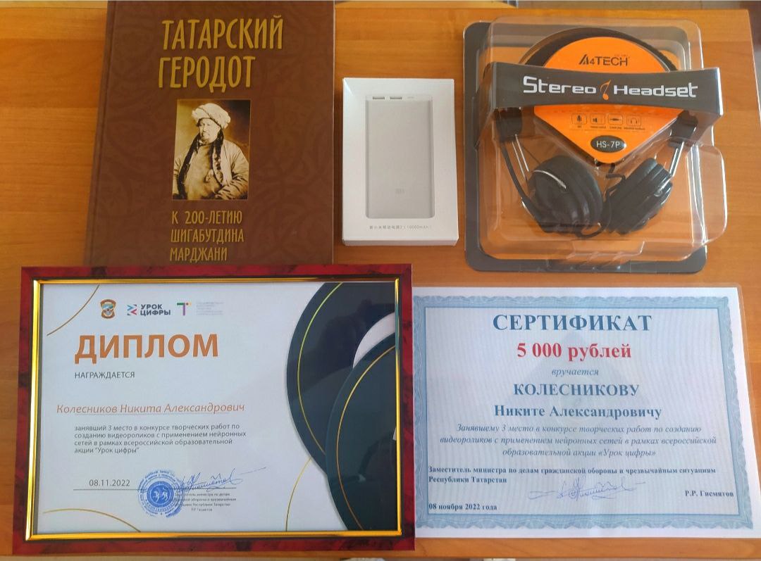 В мае 2022 года был обьявлен конкурс на лучший видеоролик в рамках Года цифровизации. В рамках конкурса принимались видеоролики на темы "Родной край" и "Любимое хобби" с применением нейронных сетей.Поздравляем ученика 9 класса Колесникова Никиту с 3 местом!!!8 ноября в торжественной обстановке ребят поздравил заместитель министра по ГО ЧС РТ Гисмятов Р., который вручил дипломы, сертификаты и ценные подарки. Молодец!!! Так держать!