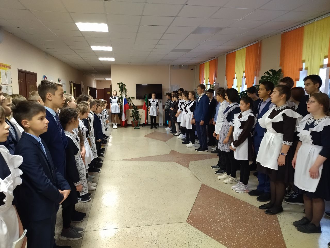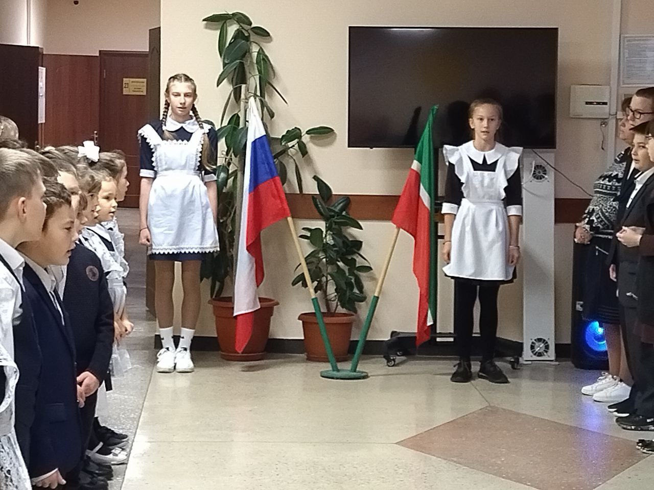 Почетное право выноса флага Российской Федерации и флага Республики Татарстан на этой неделе было предоставлено ученице 9 класса Мокшиной В. и ученице 7 класса Ахмадуллиной Д., участницам Межрегионального турнира по художественной гимнастике "Kazan Stars Open". Девочки, вы молодцы.