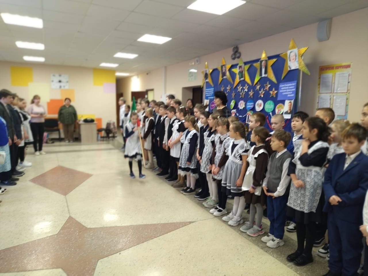 12 февраля на торжественной линейке прошло традиционное исполнение Гимнов России и Республики Татарстан. Право вынести Флаги предоставлено Мокшину Арсению, призеру зонального этапа по мини-футболу, и Фирсовой Анастасии, призеру муниципального этапа "Лыжня России-2024"