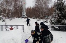 Члены юнармейского отряда очистили территорию памятника от снега.