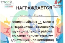 Поздравляем Скачкову Дарью, ученицу 7 класса; Сергееву Дарину, ученицу 3 класса, занявших первое место в Первенстве Тетюшского муниципального района по спортивному туризму (дистанция - пешеходная), руководитель Егоров Н.И.