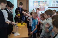 В рамках занятий по внеурочной исследовательской деятельности учащиеся 8 классов вместе с учителем физики Гульнарой Зуфаровной провели интересные опыты для учащихся 2 классов. Дети с удовольствием наблюдали за происходящими явлениями.