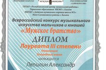 Поздравляем Лепилина А., Лауреата 3 степени; Шулаева Н., Сорокина Я. Дипломантов 2 и 3 степени Всероссийского конкурса музыкального искусства мальчиков и юношей «Мужское братство», руководители МБУДО «ДМШ» Камско-Устьинского муниципального района РТ Закирова О.В., Булатова С.В.