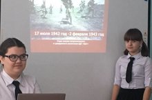 Учащиеся 7 А класса Белова Кристина и Люлюзова Ульяна под руководством классного руководителя Матюшиной А.В. подготовили классный час для своего класса. Девочки рассказали о Сталинградской битве, о героях, защищавших свой город.