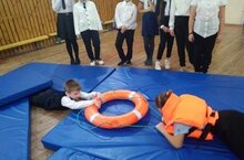 Урок «Как себя вести, если ты провалился под лёд» прошел в 5 б классе. При помощи подручных средств, ребята сымитировали водоем и льдины на нем . Пострадавшего вытаскивали при помощи круга, палки, ремня, затем обсудили, как эффективнее и безопаснее. Записали правила поведения, если вдруг провалится под лёд.