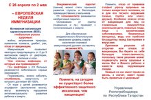 В соответствии с письмом руководителя Управления Роспотребнадзора по Республике Татарстан М.А.Патяшиной от 17.04.2021 № 07/10083 Министерство образования и науки Республики Татарстан сообщает следующее. По инициативе Всемирной организации здравоохранения в Европе, в том числе в Российской Федерации и Республике Татарстан в период с 26 апреля по 2 мая 2021г. проводится Европейская неделя иммунизации (далее ЕНИ-2021). Основная цель ЕНИ-2021 - повышение уровня знаний населения о важности иммунизации в предупреждении инфекционных заболеваний: