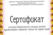 Наши воспитанники-выпускники - Хамматова Алина,Ярхамов Ильмаз, Гарифуллина Илюза и Чариев Амир награждены СЕРТИФИКАТОМ за участие во Всероссийском конкурсе детского художественного творчества "Лучше нет родного края!".(см. фотогалерею)