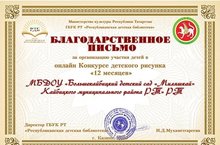 Получили благодарственное письмо Министерства культуры Республики Татарстан ГБУК РТ "Республиканская детская библиотека" за организацию участия детей в онлайн конкурсе детского рисунка "12 месяцев".