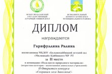Воспитатели и воспитанники нашего детского сада участвовали в II Открытом конкурсе "Сохраним леса Заволжья!" посвященного Международному дню леса. Работа воспитанницы нашего детского садаГарифуллиной Ралины (воспитатель Гумерова Р.Ф.) заняла 2 место.