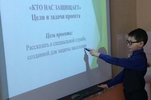 21 февраля учащиеся 3 А класса защищали проект на тему "Кто нас защищает?" Основной целью проекта является формирование навыков исследовательской деятельности. Учащиеся сами выбирали наиболее интересные темы. Ребята рассказывали своим одноклассникам про военно-морскую технику, про действующих солдат служащих в армии и т.д.. Проекты были очень интересными и ребята слушали внимательно, задавали друг другу вопросы. Ученикам очень понравилось работать над проектами патриотической тематики.