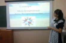 Ученики 11 «Б» класса прочитали значение слова «толерантность» с испанского, китайского, английского и русского языков, затем дали собственное понимание слова. Толерантность – это умение понимать и принимать человека любого цвета кожи, любой национальности, любого государства и региона. Не надо забывать, что мы живём в одном общем доме под названием ЗЕМЛЯ, значит все человечество - это одна большая семья. Давайте любить и ценить друг друга!!!