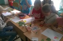 Сегодня ребята выполняли аппликации, рисовали с помощью листочков. Работы получились яркими, интересными, девочки и мальчики проявили фантазию. Кто-то изобразил божью коровку, у кого-то получилась настоящая картина, пейзаж, портрет.
