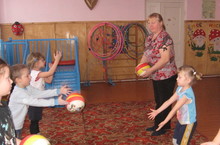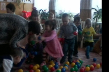 Каждый ребенок получает мячик , по очереди катит его и «оказывается в детском саду».