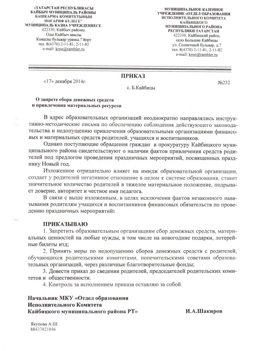 Приказ о запрете сбора денежных средств