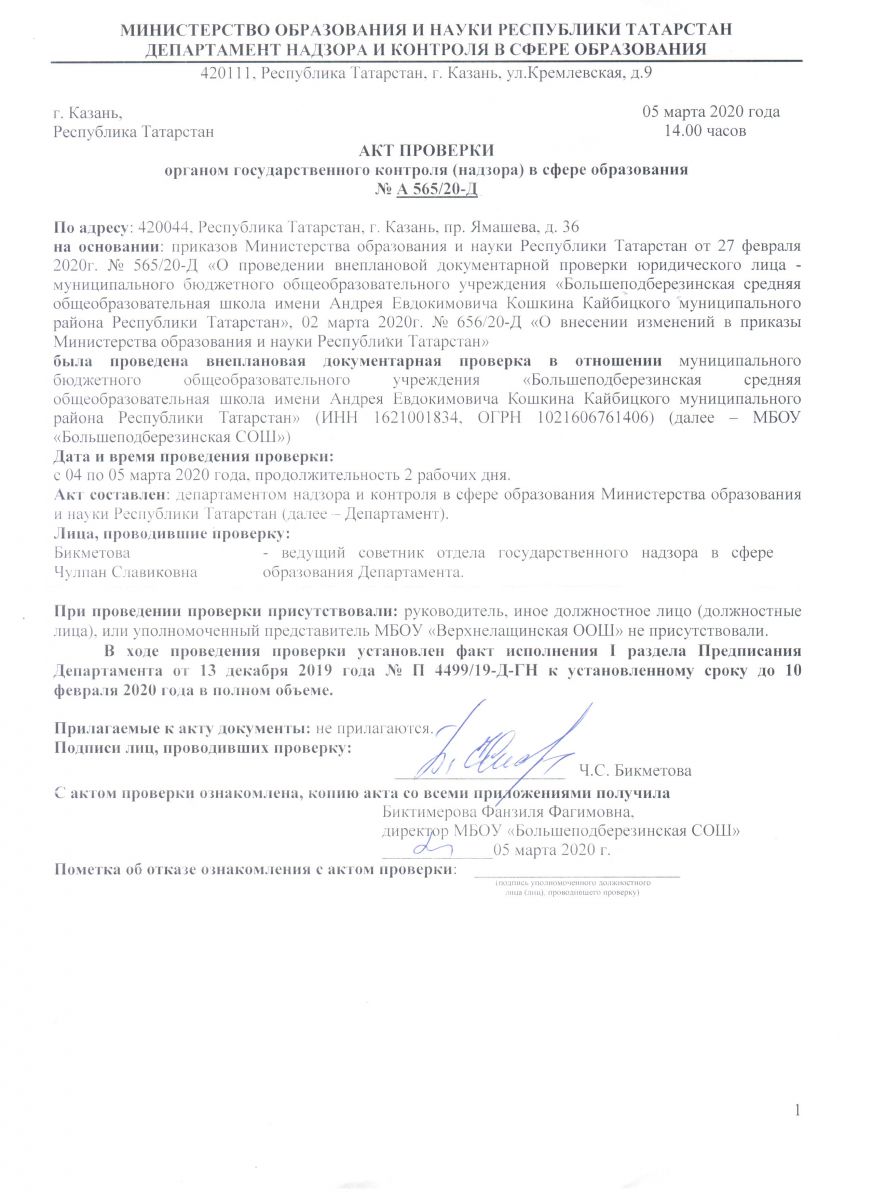 Акт проверки органом государственного контроля (надзора) в сфере образования №А 565/20-Д