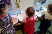 Несмотря на то, что дети маленькие, воспитатели активно учат их правильно мыть руки, мыть лицо обеими руками и круговыми движениями. Воспитанники закрепляют умение правильно пользоваться своим полотенцем, вытирать лицо, ручки.