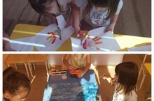 Цель: Учить превращать отпечатки ладоней в рыб, рисовать различные водоросли. Развивать воображение, чувство композиции. Закрепить умение дополнять изображение деталями.