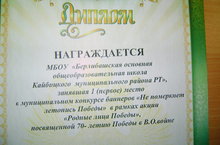Гибадуллину А, Мусину Ф, занявшие первое место в муниципальном конкурсе баннеров «Не померкнет летопись Победы» в рамках акции «Родные лица Победы», посвященной 70 -летию Победы в В.О.В