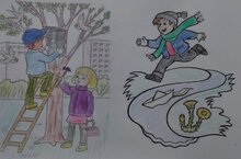 Во время весенних каникул проходит конкурс рисунков "Мои каникулы". Дети с воодушевлением обсуждают задумки рисунков, рисуют солнце, бумажные кораблики, в своих рисунках передают весенние краски. Каждый рисунок по своему интересен, индивидуален