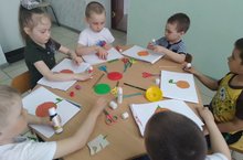 Дети в садики очень заняты, ведь сегодня очень интересная тема: апельсины - витамины. Их надо аккуратно вырезать, а потом правильно приклеивать.