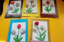Уеннарыбызны онытып,кулларыбызга төсле кәгазьләр алдык та,Бөек Җиңү көненә открытка ясадык.