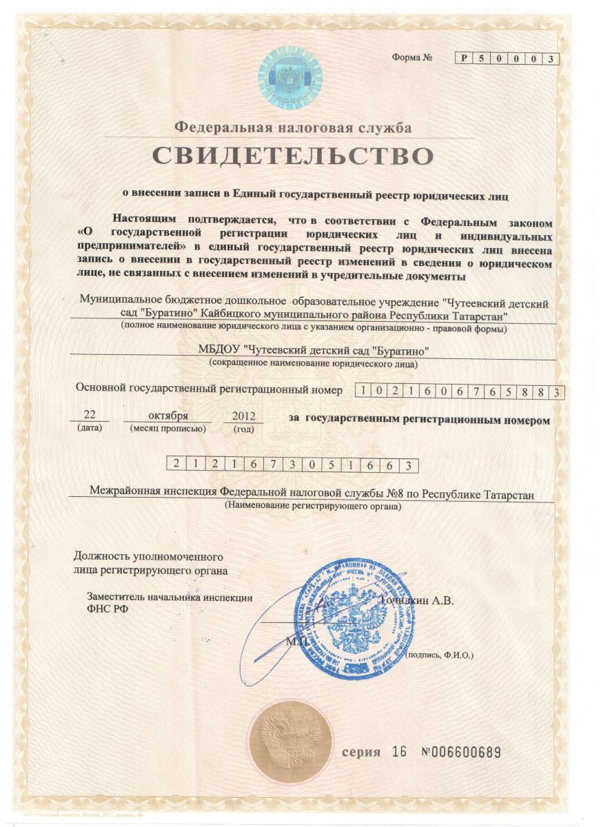 Короткое название: МБДОУ " Чутеевский детский сад "Буратино"Кайбицкого муниципального района РТ "