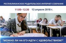 Уважаемые родители, 13 апреля 2018 года с 11.00-12.30 пройдет республиканское родительское интернет-собрание на тему " Можно ли на ЕГЭ идти с удовольствием?" (Об эффективных методиках подготовки детей и подростков к аттестации знаний). online-трансляция на сайте киу.рф , задать свои вопросы можно по адресу:roditelirt@mail.ru