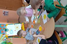 Цели: учить детей передавать в рисунке образ солнышка, сочетать округлую форму с прямыми и изогнутыми линиями; закреплять умение отжимать лишнюю краску о край баночки; учить дополнять рисунок изображениями, соответствующими теме; развивать самостоятельность, творчество.