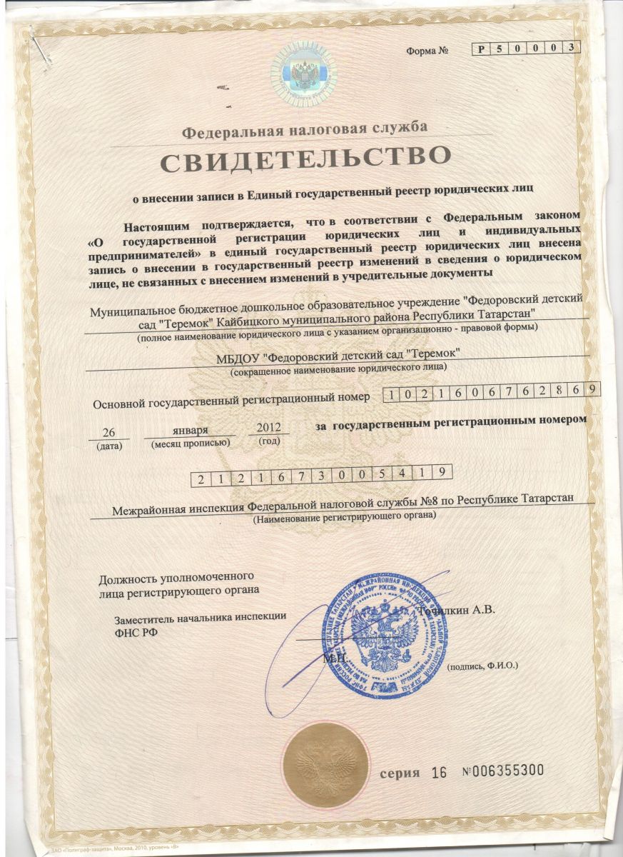 Короткое название: МБДОУ "Фёдоровский детский сад "Теремок"