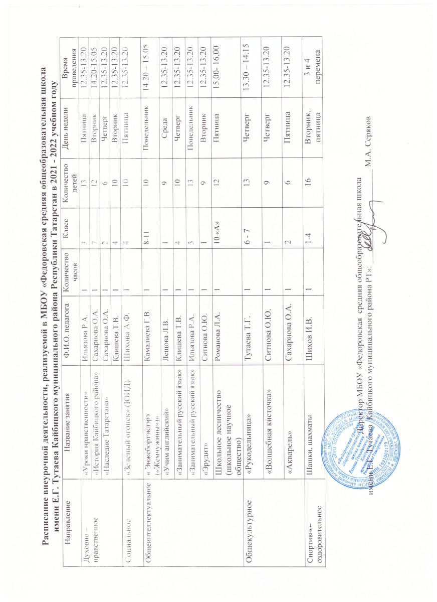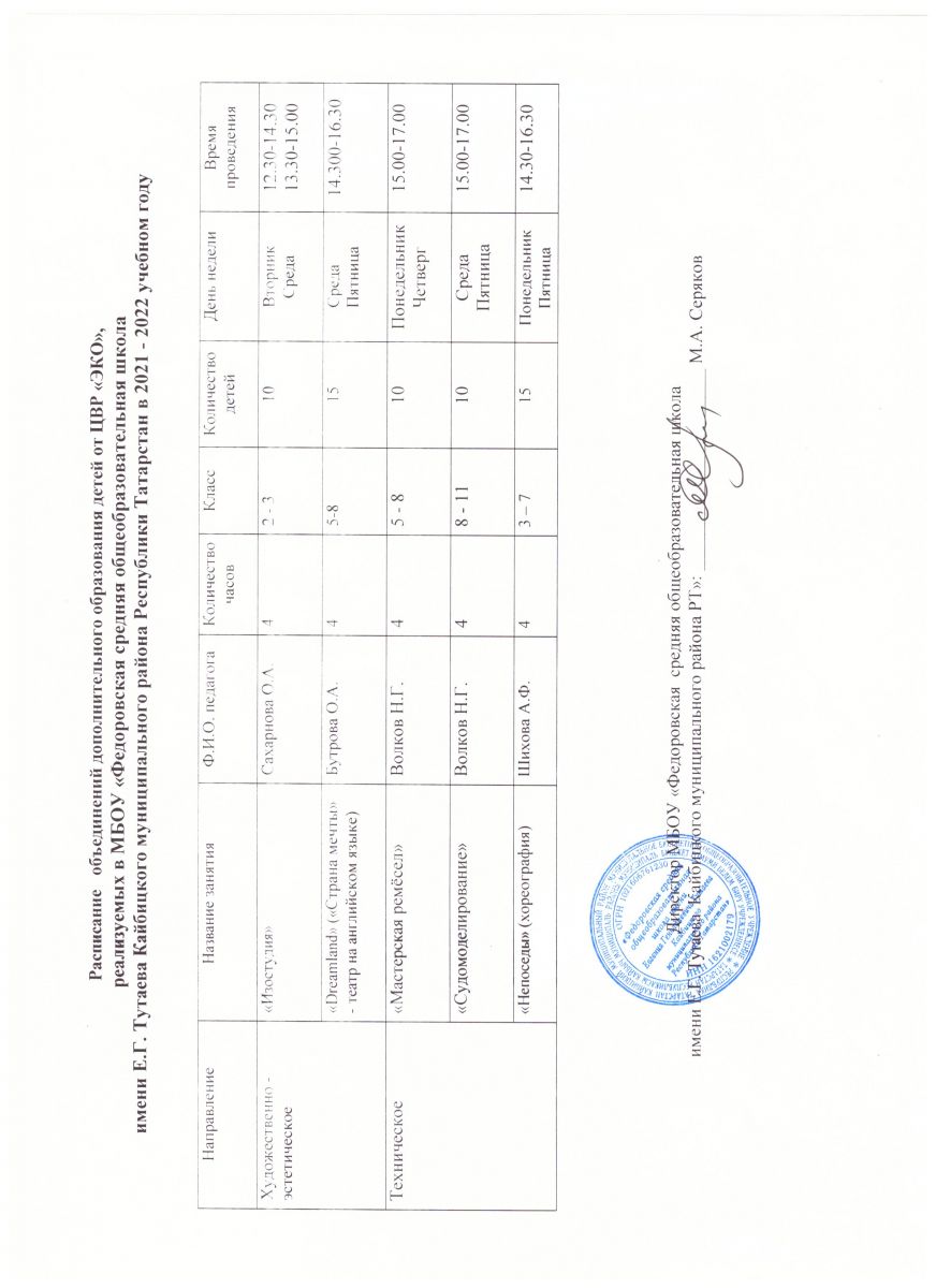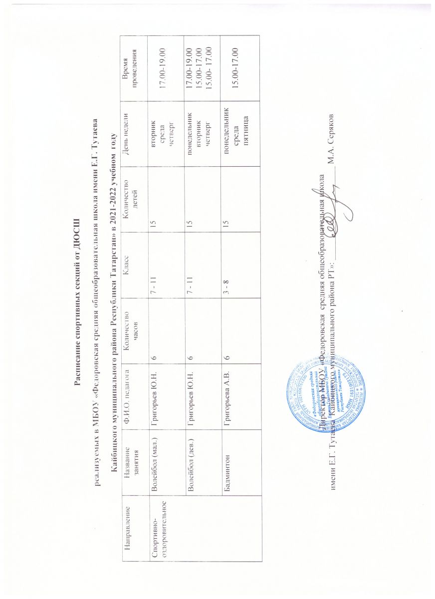 Расписание спортивных секций от СШ, реализуемых на базе МБОУ "Федоровская СОШ имени Е.Г. Тутаева"