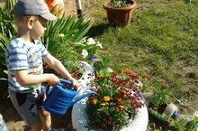 Все дети по своей природе садоводы, и дачники, они просто обожают рыться в песке, да и в любой грязи, и все это заливать водой. А еще наши малыши любят играть в садоводство. Каждое утро ребята спешат посмотреть, как растут посаженные ими цветы: бархатцы, петунии, с удовольствием ухаживают за ними, поливают и пропалывают, радуются первым распустившимся бутонам.