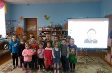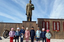 ”Аленушка” балалар бакчасының кечкенәләр төркеме балалары тәрбияче Краснова В.А. белән сугышта вафат булган якташ геройларга куелган һәйкәл янында булдылар. Җиңү көне уңаеннан безнең илебезне саклаучылар турында сөйләштеләр. Бөек Ватан сугышы бик озак барган. Илгә, аның кешеләренә зур кайгылар, җимерүләр алып килгән. Бүген без тыныч илдә яшибез. Җиңү көнендә сугыш ветераннарын, олы яшьтәге әби – бабайларны бәйрәм белән котлыйбыз, аларга саулык – сәламәтлек телибез. Бөек җиңүне фронттагы солдатлар, авыл-шәһәрдә эшләүче кешеләр яулаган. Бик күпләр сугыш кырында үлеп калганнар. Аларның батырлыгын искә алып, һәйкәлләр куялар. Һәйкәлләр янында һәрвакыт тере чәчәкләр. Бу чәчәкләр сугышта катнашкан, батырлык күрсәткән, гаиләләренә кайта алмаган солдатларга рәхмәт билгесе һәм истәлеге. Сугыш ветераннары елдан - ел азая бара. Алар сез яшәгән авылда яшәргә мөмкин. Аларны күрсәгез, бәйрәм белән котларга онытмагыз. “Бәйрәм белән! Җиңү өчен сезгә рәхмәт”, - дип әйтегез.