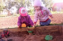 Играя в песочнице, дети чувствуют себя настоящими искателями. Одна из любимых игр детей это «Золотоискатели». Воспитатель закапывает камешки в песочнице, а дети благодаря лопаткам и сито стараются найти эти камни. Также наши малыши очень любят игру «Забавные ладошки». Они делают отпечатки своих ладошек по мокрому песку палочкой и им это очень нравиться.