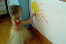 Кечкенәләр төркеме балалары тәрбияче Краснова В.А. белән кисеп ябыштыру шөгылендә нурлы кояш образын кисеп ябыштырды. Балаларны язга хас булган күренешләр белән таныштыруны дәвам итеп (кар эри, тамчы тама, кояш җылыта, сулар җыела), язгы табигатьтәге гади бәйләнешләрне (кояш ныграк җылыта – көннәр җылына – кар эри) режим барышында боз сөңгеләрен, тал песиен ябыштырды. Йортлар һәм биналар яннарыннан үткәндә боз сөңгеләреннән сак булырга кирәк турында сөйләштеләр.