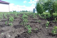 От момента весенней обработки почвы прошло около месяца. Сегодня в школе произвели высадку рассады томатов. Вот некоторые правила высадки: если у рассады стандартные размеры (высота 25-35 см и 8-10 настоящих листьев), ее сажают обычным способом. Выкапывают лунку размером чуть больше, чем земляной ком растения. В ней вертикально устанавливают саженец и засыпают его плодородной землей до семядольных или первой пары настоящих листьев. Переросшую же рассаду томатов сажают описанным ниже способом: выкапывают яму глубиной 8-10 и длиной 20-30 см. Саженец располагают под углом 45 градусов таким образом, чтобы корни его были направлены на юг, а ствол – на север. При посадке следят за тем, чтобы ствол саженца не касался почвы, а нижние листья располагались на высоте 15-20 см от нее. Чтобы этого добиться, самые нижние листья удаляют. Только делать это желательно заранее, чтобы ранки успели подсохнуть, и в них не попала инфекция.