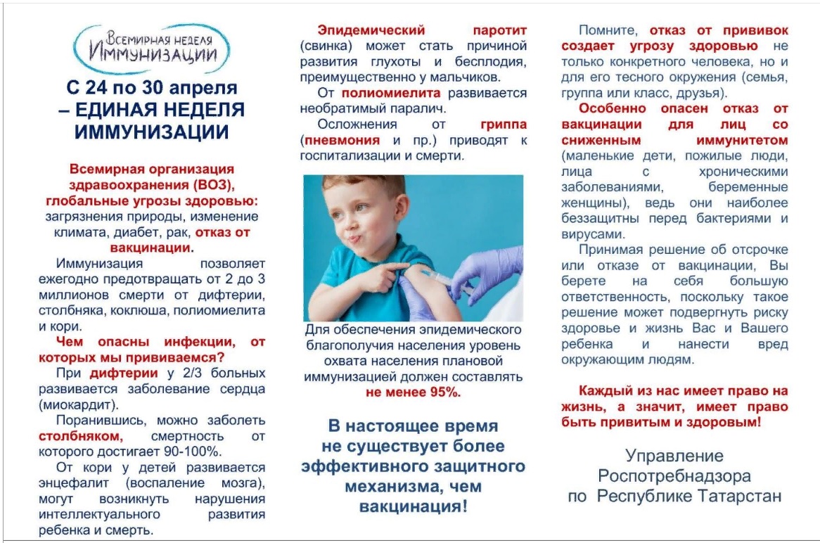 В соответствие с письмом Руководителя Управления Федеральной службы по надзору в сфере защиты прав потребителей и благополучия человека по Республике Татарстан (Татарстан) от 18.04.2022 № 07/7932 «О проведении ЕНИ-2022» Министерство образования и науки Республики Татарстан сообщает, что в период с 25 по 30 апреля 2022 года проводится Единая неделя иммунизации. Основная цель ЕНИ-2022 – повышение уровня знаний населения о важности иммунизации в предупреждении инфекционных заболеваний.
