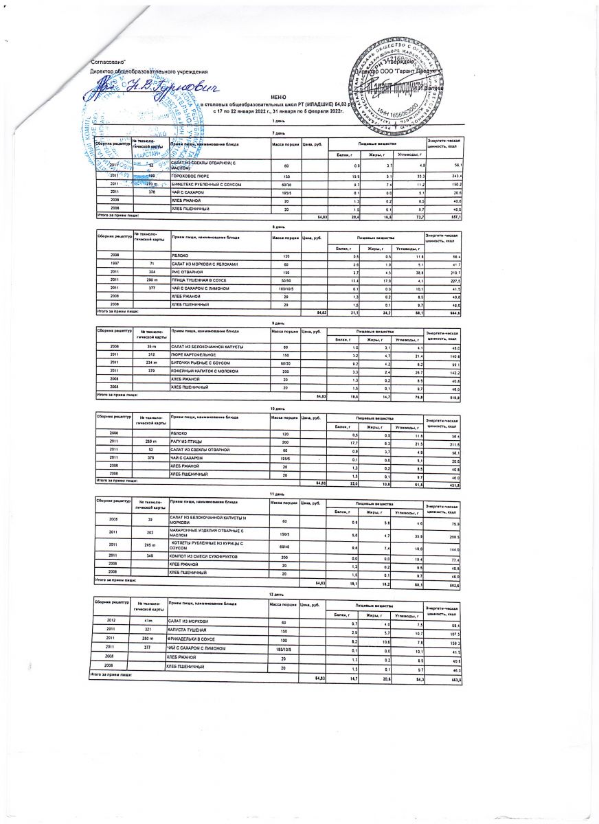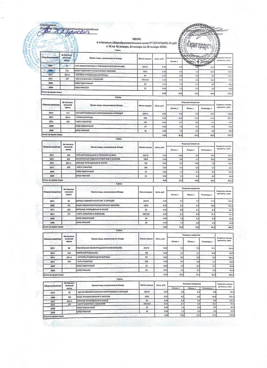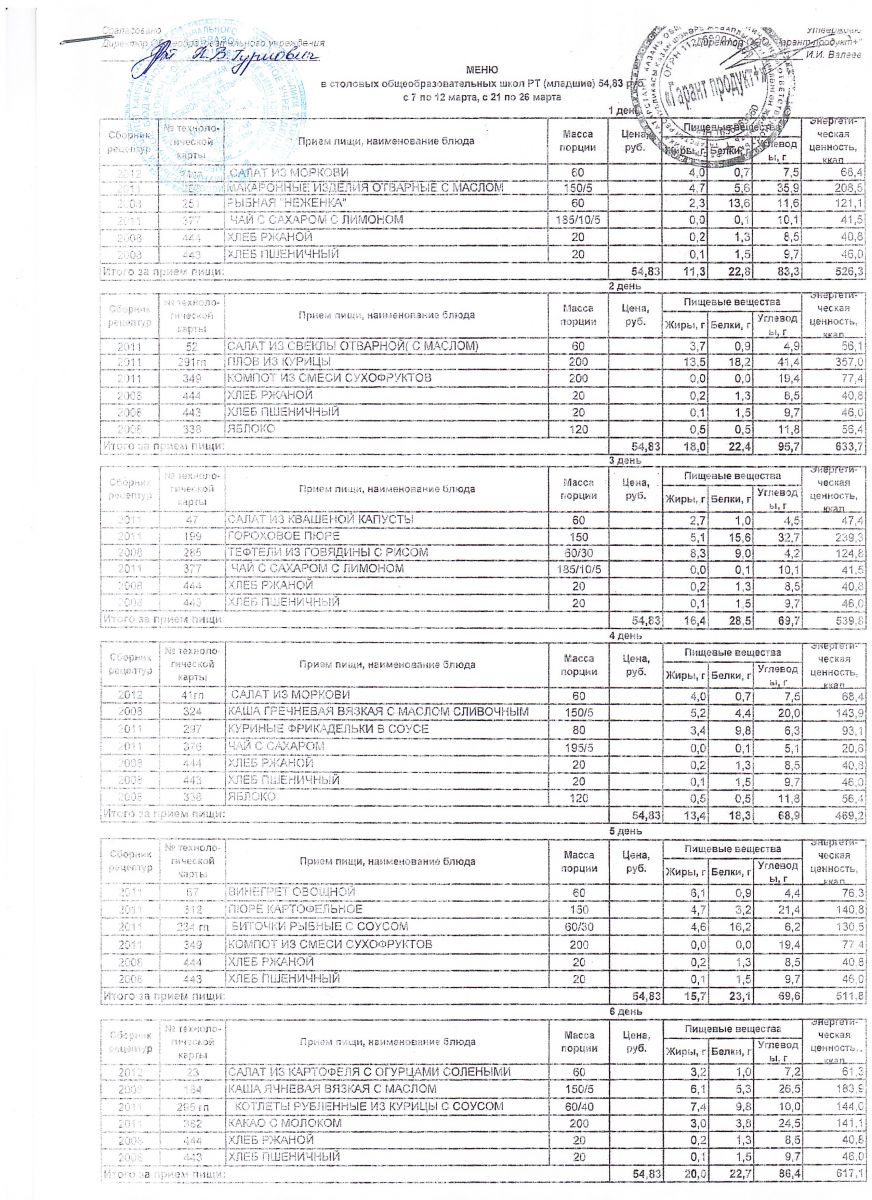 Меню в столовых общеобразовательных школ РТ (младшие) 54,83 руб