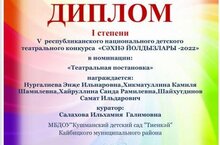 Безнең “ Тиенкәй” балалар бакчасы балалары Нургалиева Энҗе, Хикматуллина Камилә, Хайруллина Сәйдә, Шайхутдинов Самат , тәрбияче апалары Ильхамия Галим кызы җитәкчелегендә Республика күләмендәге V нче милли балалар театры конкурсында катнаштылар. Сезне конкурста җиңүегез белән котлыйбыз һәм яңа иҗади ачышлар телибез!