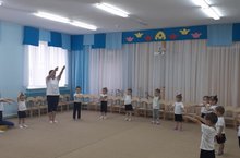Кечкенәләр төркемендә гимнастика вакыты. Кечкенә генә булсалар да балалар зарядканы үз итәләр, тырыша-тырыша күнегүләр эшлиләр.