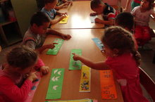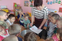 Икенче кечкенәләр төркеме балалары ябыштыру шөгылендә (тәрбиячеләре Асадуллина Д.Р.) уенчык образларын(пирамида) чагылдырырга өйрәнделәр. Детальләрне зурлыклары буенча дөрес урнаштыруга ирештеләр. Җилемне пумалага кирәк кадәр генә алып әзер түгәрәкләрне дөрес итеп ябыштырдылар. Балалар үзләренең эшләреннән бик канәгать калдылар.