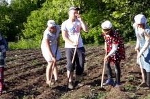 Мәктәп бакчасында укучыларның җәйге практикасы уза. Укучылар яшелчәләргә сулар сибәләр,чүптән арындыралар,чәчәклекләрне тәртиптә тоталар.